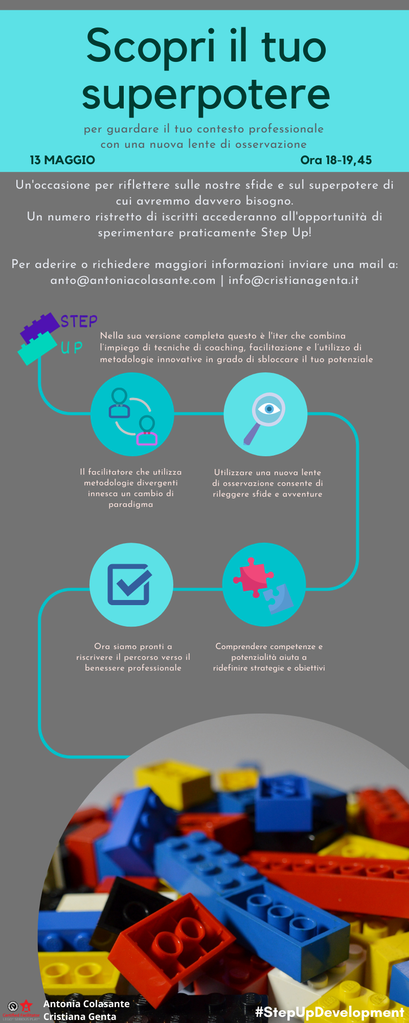 Pensiamo al nostro lavoro attuale, le nostre problematiche quotidiane, e a quale SuperPotere sarebbe necessario per alleviare fatica e farci raggiungere la soluzione. Questa è la sfida che lanceremo il 13 maggio ad un gruppo ridotto di partecipanti che vorranno sperimentare Step Up, un modo meno convenzionale per confrontarsi con obiettivi e strategie professionali.